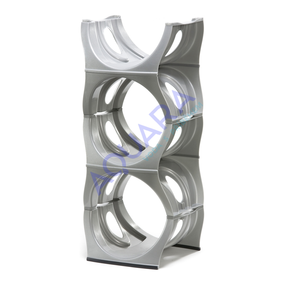 Světle šedý plastový stojan na barely. Jedná se o výrobek v luxusním provedení. Stojan může stát v interiéru vedle aquamatu, ušetří místo a máte k dispozici rychle vždy 4 náhradní demižony.