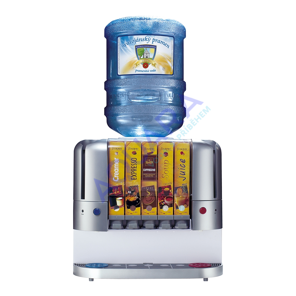 Stolní výdejník vody, který je v přední části doplněn o držák na 5 instantních nápojů FISAPAC. Aquamat vydává jak vodu studenou, tak vodu horkou. Výdej horké vody je opatřen bezpečnostní pojistkou proti opaření. Na levé i pravé straně je integrovaný zásobník na kelímky.