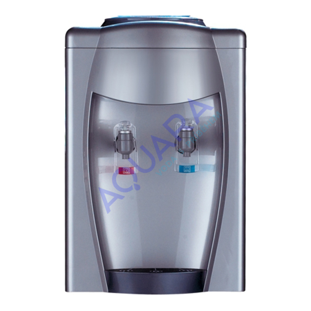 Stolní výdejník, aquamat, ve stříbrné barvě na studenou a horkou vodu určený k postavení na skříňku či stolek. Boky přístroje jsou ze stříbrného plechu a přední část ze stříbrného plastu. Na boční straně výdejníku se samostatně vypíná či zapíná ohřev a chlazení, takže je možnost při vypnutí ohřevu čerpat z červeného kohoutku vodu nechlazenou a používat aquamat k výdeji vody chlazené a nechlazené (pokojová teplota).